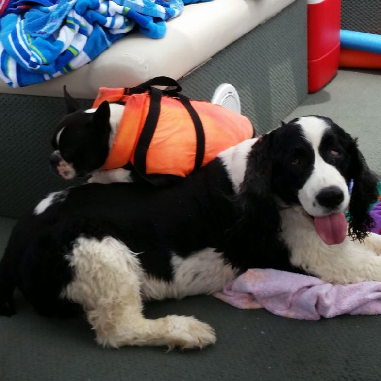 Photo: Chief with lifejacket, lays on Bear on the way to dive for golf balls